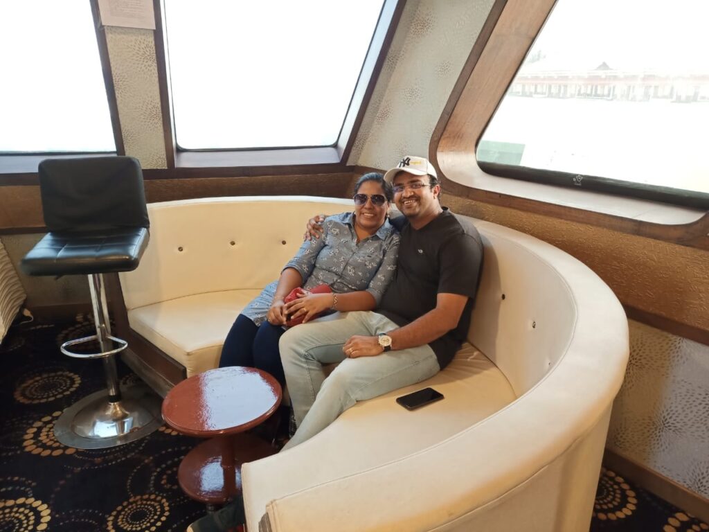 ഒരു 150 നടുത്ത് യാത്രക്കാർ ഞങ്ങൾ ചെല്ലുമ്പോൾ കപ്പലിനടുത്ത് നിൽക്കുന്നുണ്ടായിരുന്നു.അവർ ഗ്രൂപ്പ് ആയി വന്നതു കാരണം അവർക്കു മുന്നേ ഞങ്ങളെ കപ്പലിലേക്ക് പ്രവേശിപ്പിച്ചു. നട്ടുച്ചവെയിലിന്റെ കാഠിന്യത്തി ൽ നിന്നും ഒരു രക്ഷ ! എൻട്രൻസിൽ തന്നെ നമ്മളെയും കാത്ത് വളരെ മനോഹരമായ ഈജിപ്ഷ്യൻ സുന്ദരി നെഫർറ്റിറ്റിയുടെ വലിയ ഒരു ശിൽപം റിസപ്ഷൻ ഏരിയയിൽ ഉണ്ട്.കൂടെ നിന്ന് കുറച്ച് ഫോട്ടോസ് എടുത്ത് നേരെ സിസ്ട്ര എന്ന് പേരിട്ട ബാങ്കറ്റ് ഹാളിലേക്ക്.