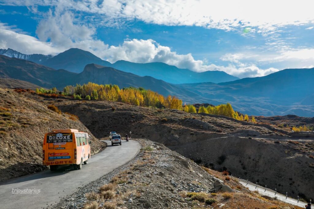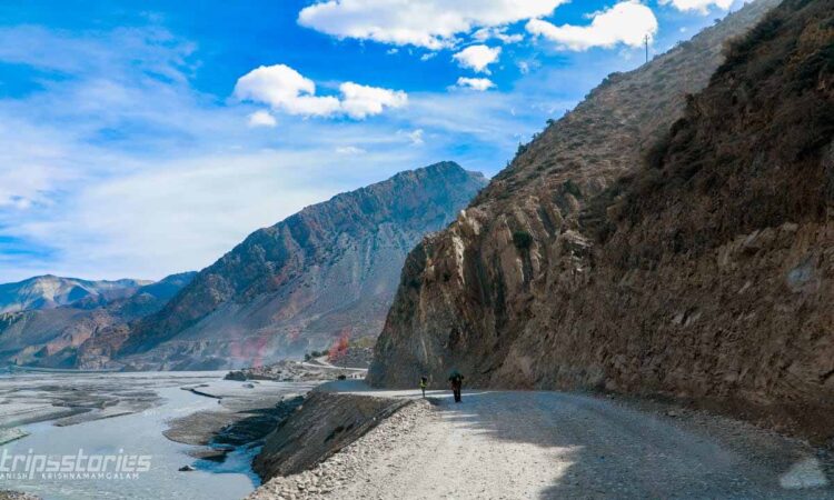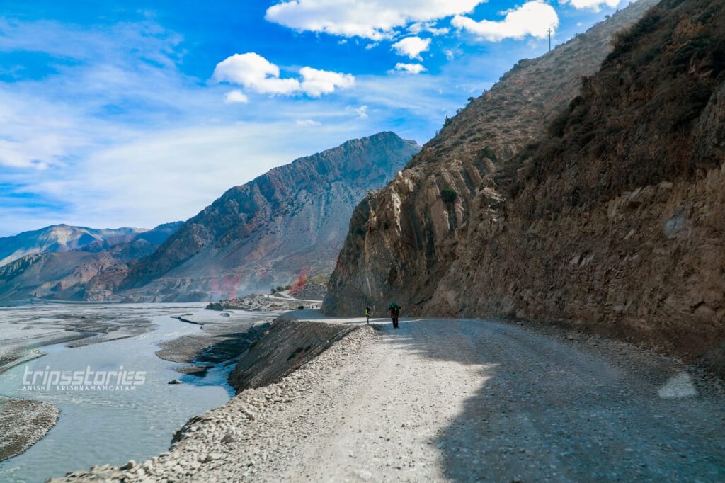 മങ്കിക്യാപ്പും ജാക്കറ്റും ക്യാമറയും മാത്രമെടുത്ത് വണ്ടിയുടെ മുൻ സീറ്റിൽ തന്നെ ഇരിപ്പുറപ്പിച്ചു. ബസ് ഗ്രാമത്തിന്റെ പുറത്തേക്ക് കടക്കുമ്പോൾ ദൂരെ മല അരിഞ്ഞുണ്ടാക്കിയ പാതയിലൂടെ പൊടി പറത്തി വാഹനങ്ങൾ അരിച്ചരിച്ച് നീങ്ങുന്നത് കാണാം. കല്ലും മണ്ണുമല്ലാതെ ഒരു പുൽനാമ്പ് പോലും ഇൗ പ്രദേശത്തെങ്ങും കാണാൻ ഇല്ല. ഇടയ്ക്ക് ഗണ്ടകി നദിയുടെ ഒരു കൈവഴി കുറുകെ കടന്നു. അവിടെ വിശാലമായ നദിയുടെ നടുവിൽ മാത്രം ഉയരത്തിൽ പണിതീർത്ത ചെറിയൊരു പാലം. ബാക്കി ഭാഗം ഓരോ പ്രളയത്തിന് ശേഷവും മണ്ണിട്ട് വഴി നിർമിക്കുകയാണെന്ന് തോന്നുന്നു.